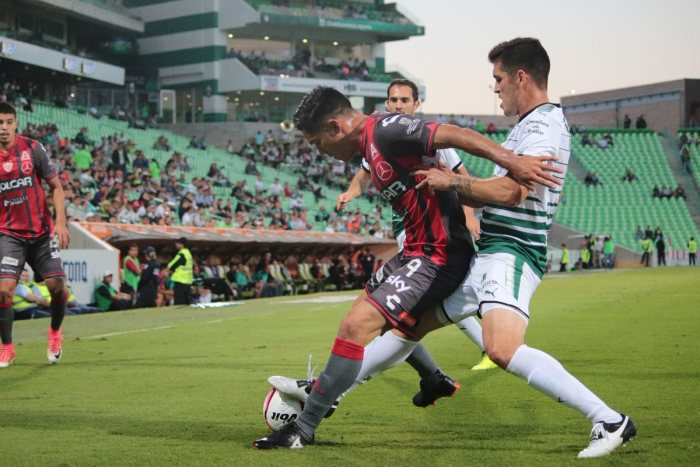 Santos y Necaxa no pudieron hacerse daño en la primera mitad. Los laguneros tuvieron el balón en su dominio; dos intentos por parte de Ronaldo Cisneros y un cabezazo de Carlos Izquierdoz que acabó en el travesaño, sin embargo, el gol no hizo presencia.